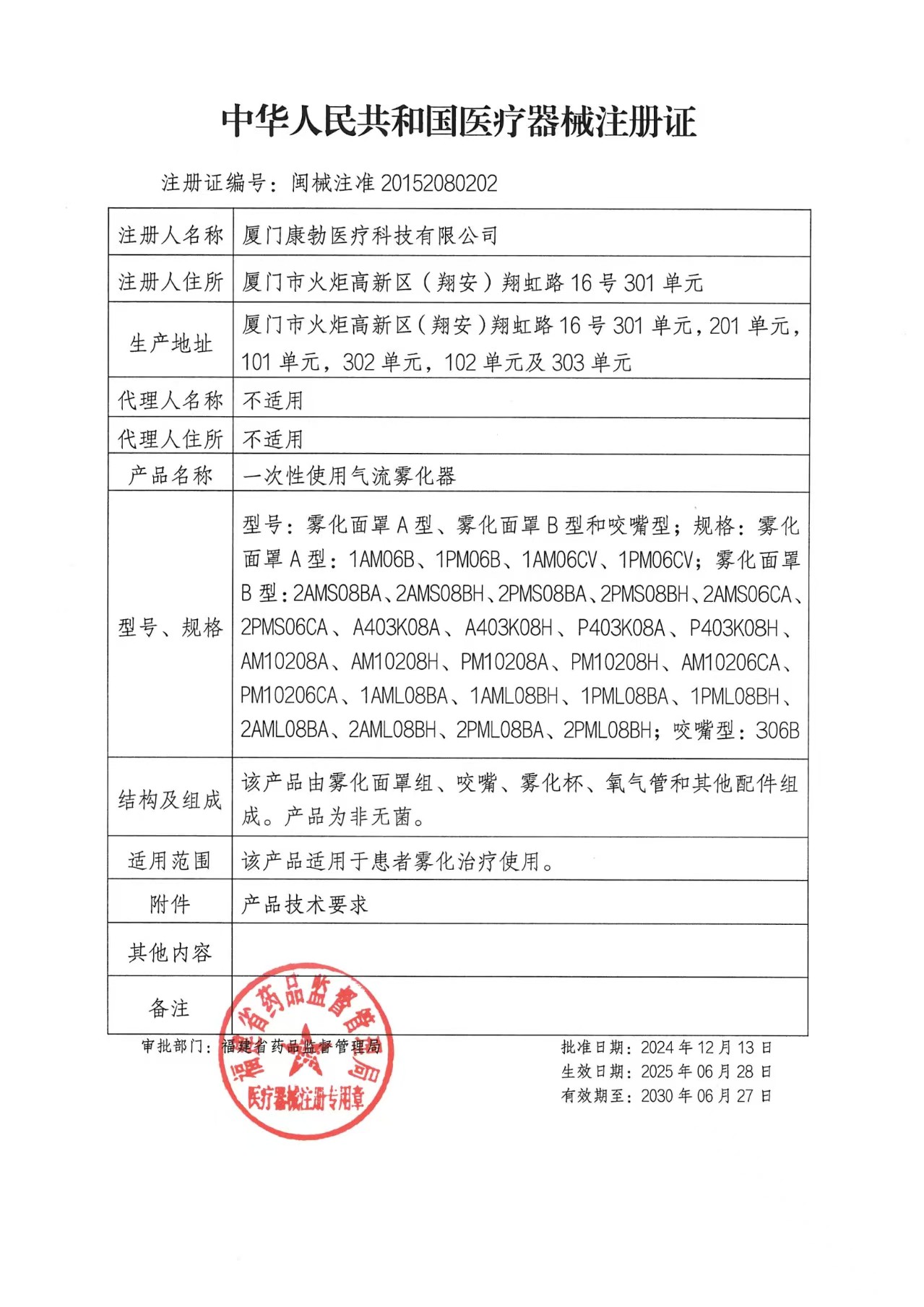一次性使用氣流霧化器注冊(cè)證