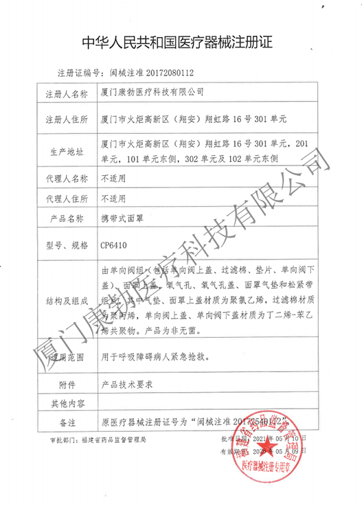 一次性使用呼吸過濾器注冊證