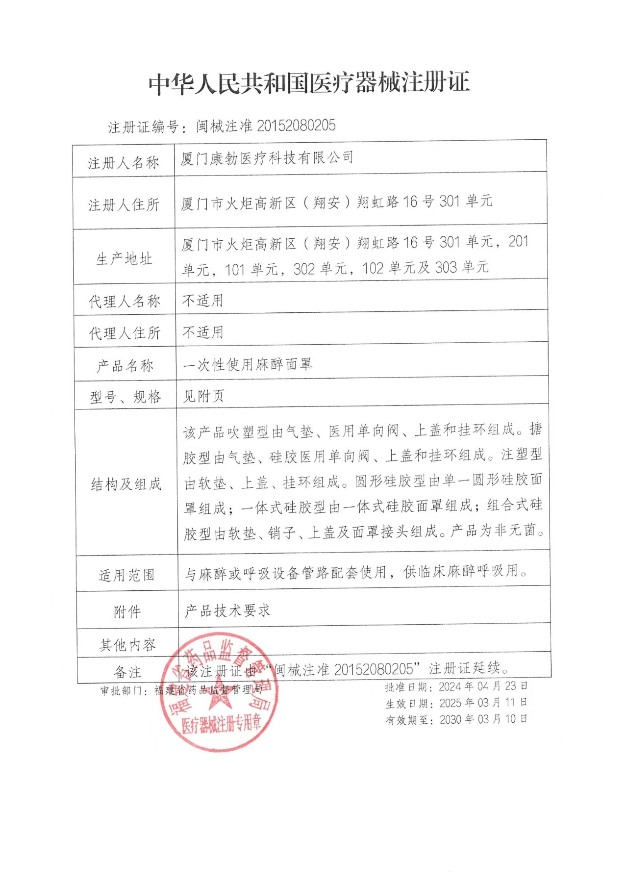一次性使用麻醉面罩注冊證