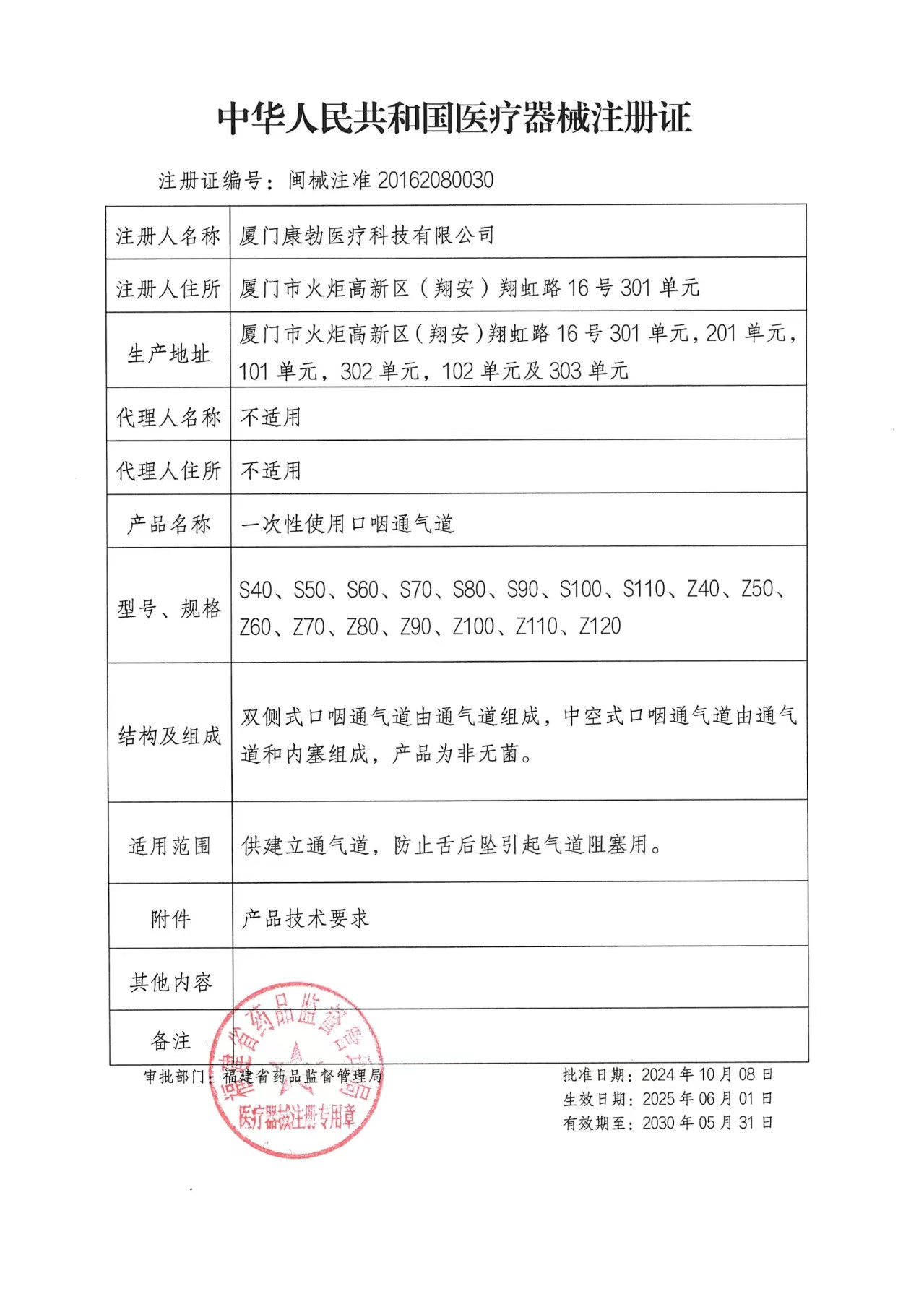 一次性使用口咽通氣道注冊證
