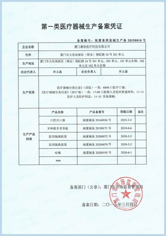 Class I medical device listing information sheet by CFDA