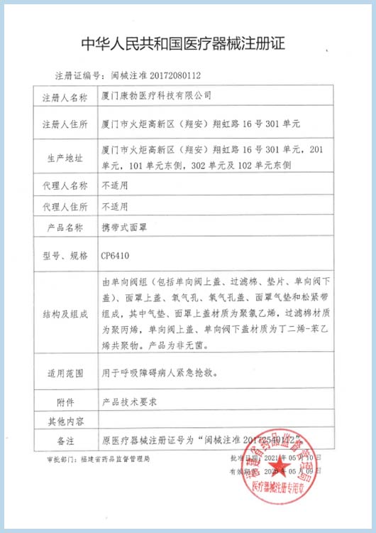 CPR mask Registration certificate by CFDA